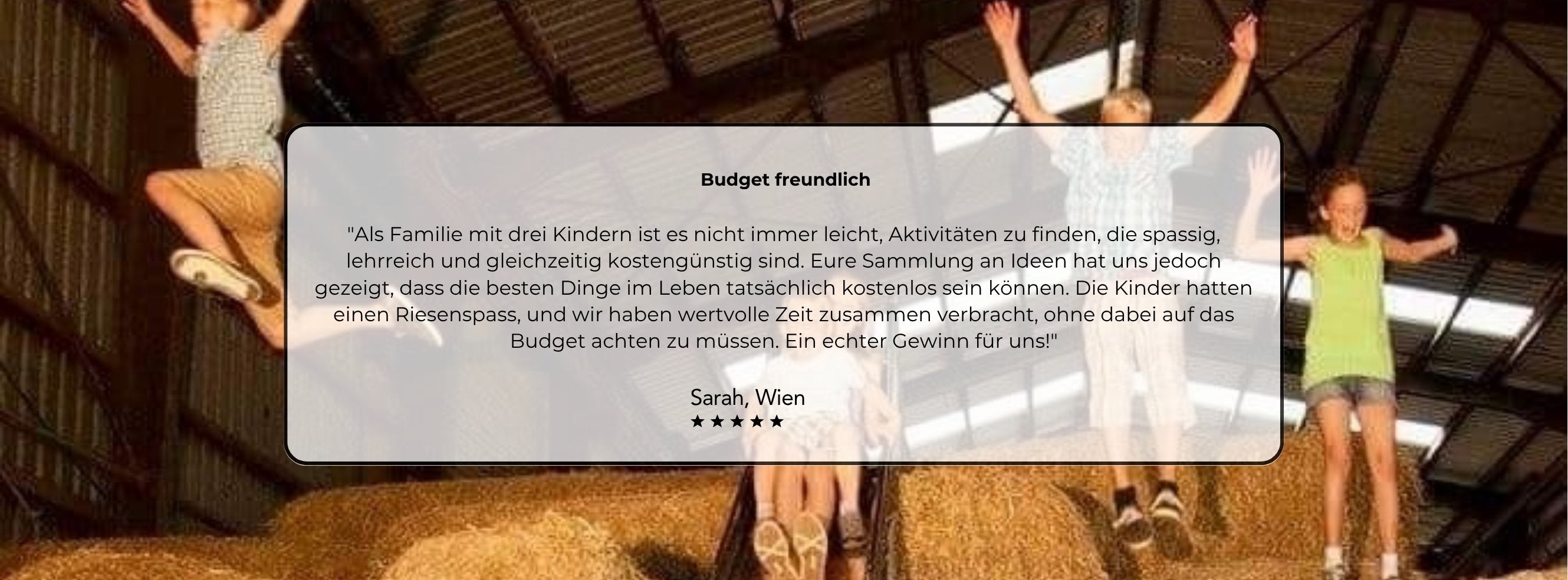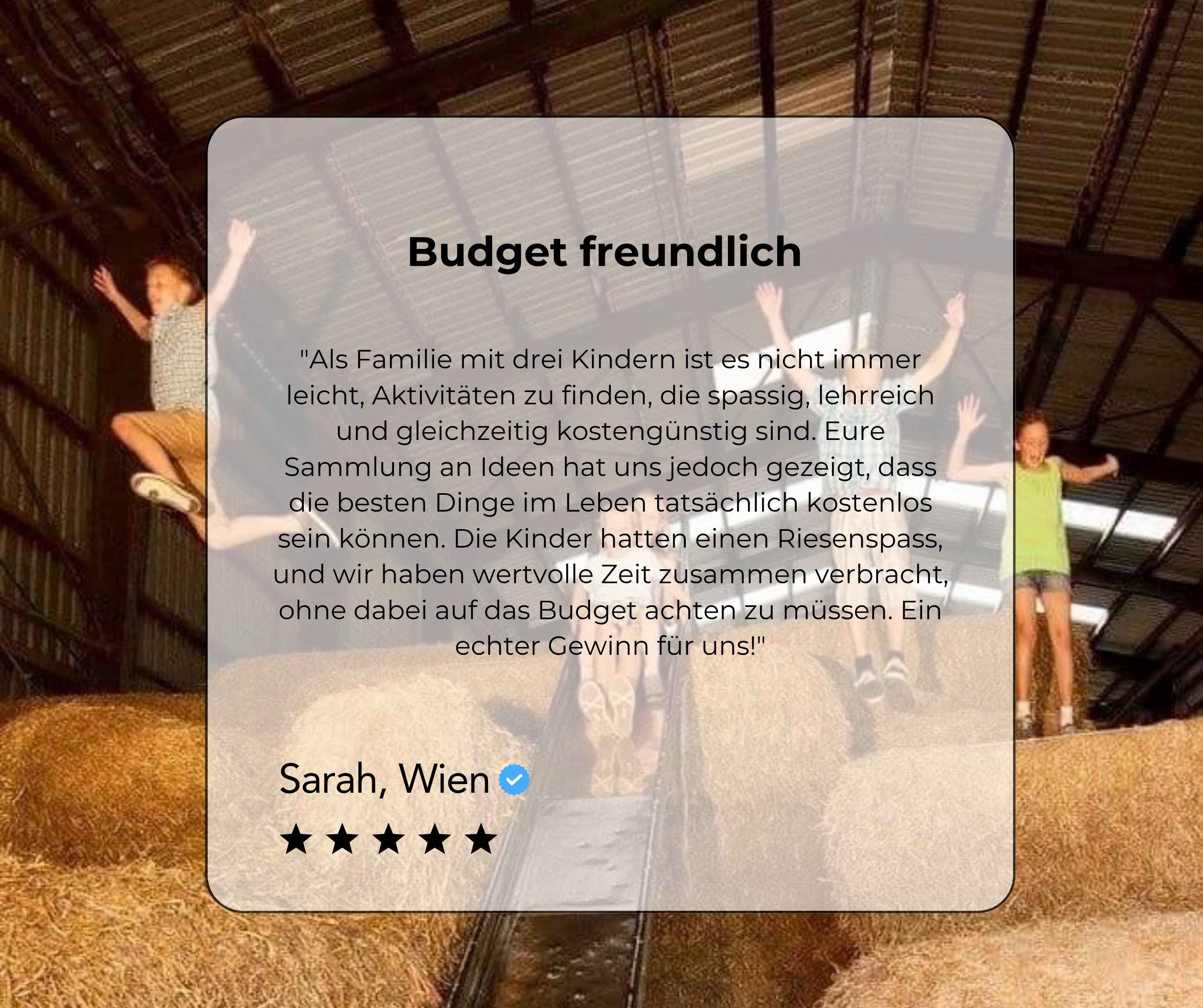 Ja, unsere Ideen sind so konzipiert, dass sie für jedes Budget geeignet sind. Wir verstehen, dass Familien unterschiedliche finanzielle Möglichkeiten haben, und möchten sicherstellen, dass alle die Chance haben, gemeinsam unvergessliche Momente zu erleben. Deshalb bieten wir eine breite Palette von Abenteuern an, von kostenlosen Ausflügen, die keine weiteren Ausgaben erfordern, bis hin zu Optionen, die eine kleine Investition benötigen. Unser Ziel ist es, dass jede Familie, unabhängig von ihrem Budget, Zugang zu qualitativ hochwertigen, bereichernden und spassigen Aktivitäten hat, die die Bindung stärken und dauerhafte Erinnerungen schaffen.